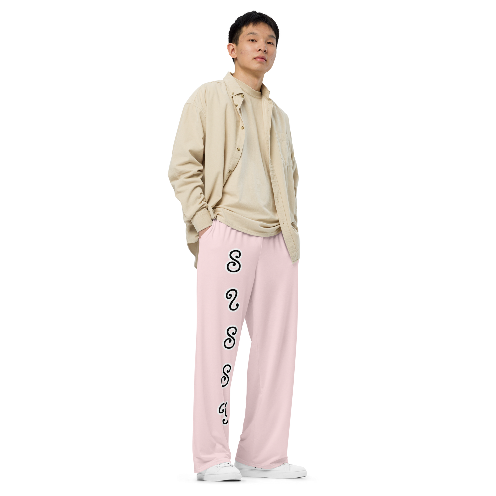 These pants are a pale pink with "Sissy" vertically written down the right pant leg in white lettering with black outlines